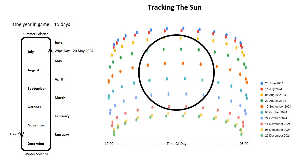 In the picture below, it shows how the Sun will traverse the sky over 6 Rust months or 7ish real days. A day in the game is an hour of real time. This means it takes about 15ish days for a full Rust Year.