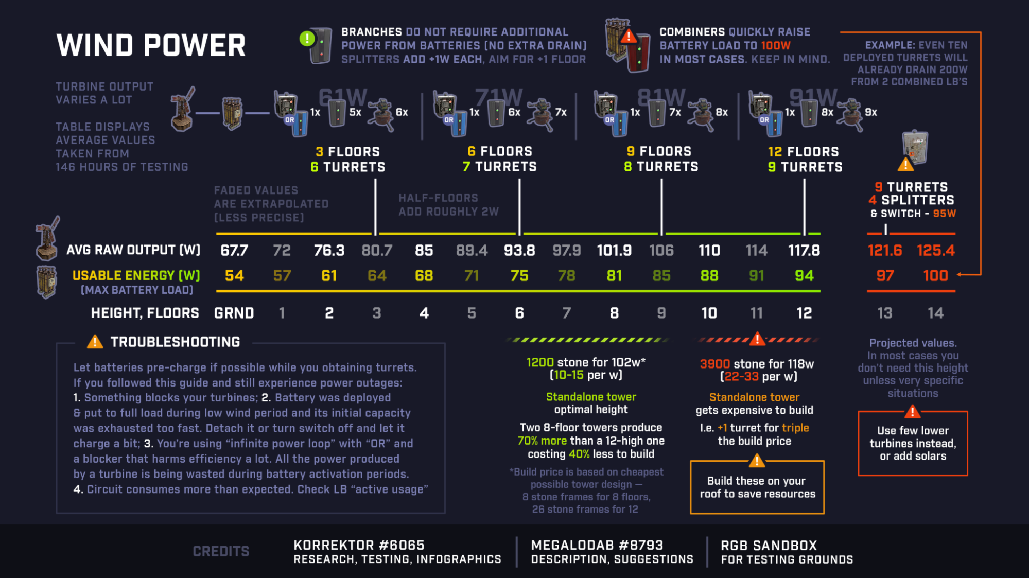 This next image is a very nice breakdown specifically for the Inline battery backup. It shows the turbines average power per floor and the usable amount of power from a battery. It also shows how many Auto Turrets a single Wind Turbine and Large Battery combo could support. It even shows how much stone each Rust Watt costs when building dedicated Wind Turbine towers. The stone calculations are now a little low. There was an update to the game that prevents turbines from being built on the tops of double door frames. Now a floor is needed under them which adds to the stone cost.