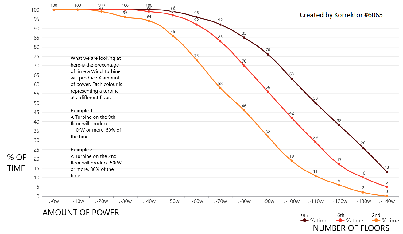 If average output means that 50% of the time the turbine is producing more or less power, then with the same data points, it’s also possible to find out the amount of time a turbine will be producing a specific amount of power or more for. For example, let’s say there was a need for a turbine to produce 30rW but it had to produce that much 99.9% of the time. How high would this turbine need to be? In this next picture, there are examples of the 2nd, 6th and 9th floors. Using this data, a turbine built 6 floors or more high, would be able to supply 30rW, 99.9% of the time. If anyone would like to collect the data for the remaining floors, I’d happily add it.