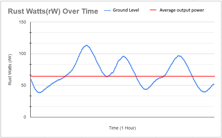 The picture above is from a random hour and its purpose is to show the randomness of wind. During this hour, the turbine’s max output was only 113rW and its lowest output was 39rW. If this graph was stretched out to 100+ hours, it would show that the most common fluctuations are about 50rW + or - the average output. However, at some point, if the graph was stretched out long enough, we would see the turbine max out and produce 150rW. Likewise, we would also see its production drop to 0rW. The higher the turbine is, the more often it will max out at 150rW. The lower the turbine is, the less often it will max out at 150rW. At all heights, they have an equal chance to hit 0rW though it is very rare. Due to this fluctuation, the most reliable thing to do was find the average over a long period of time and that is how 93rW on the 6th floor became the number that is used today.
