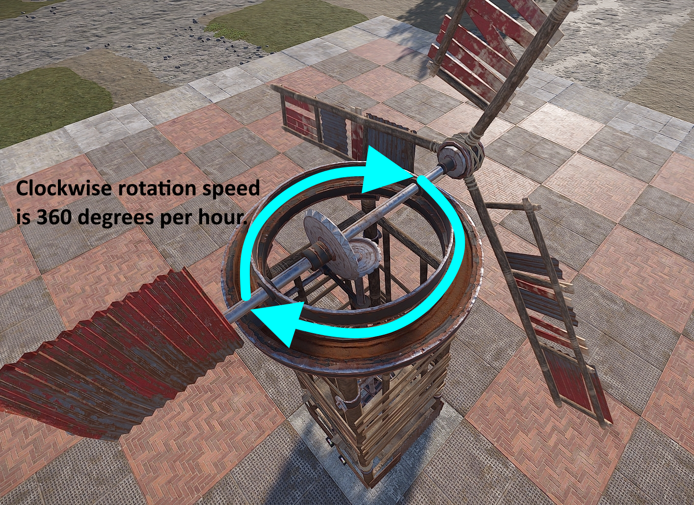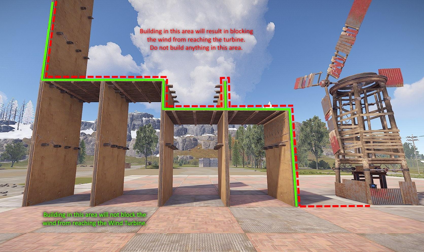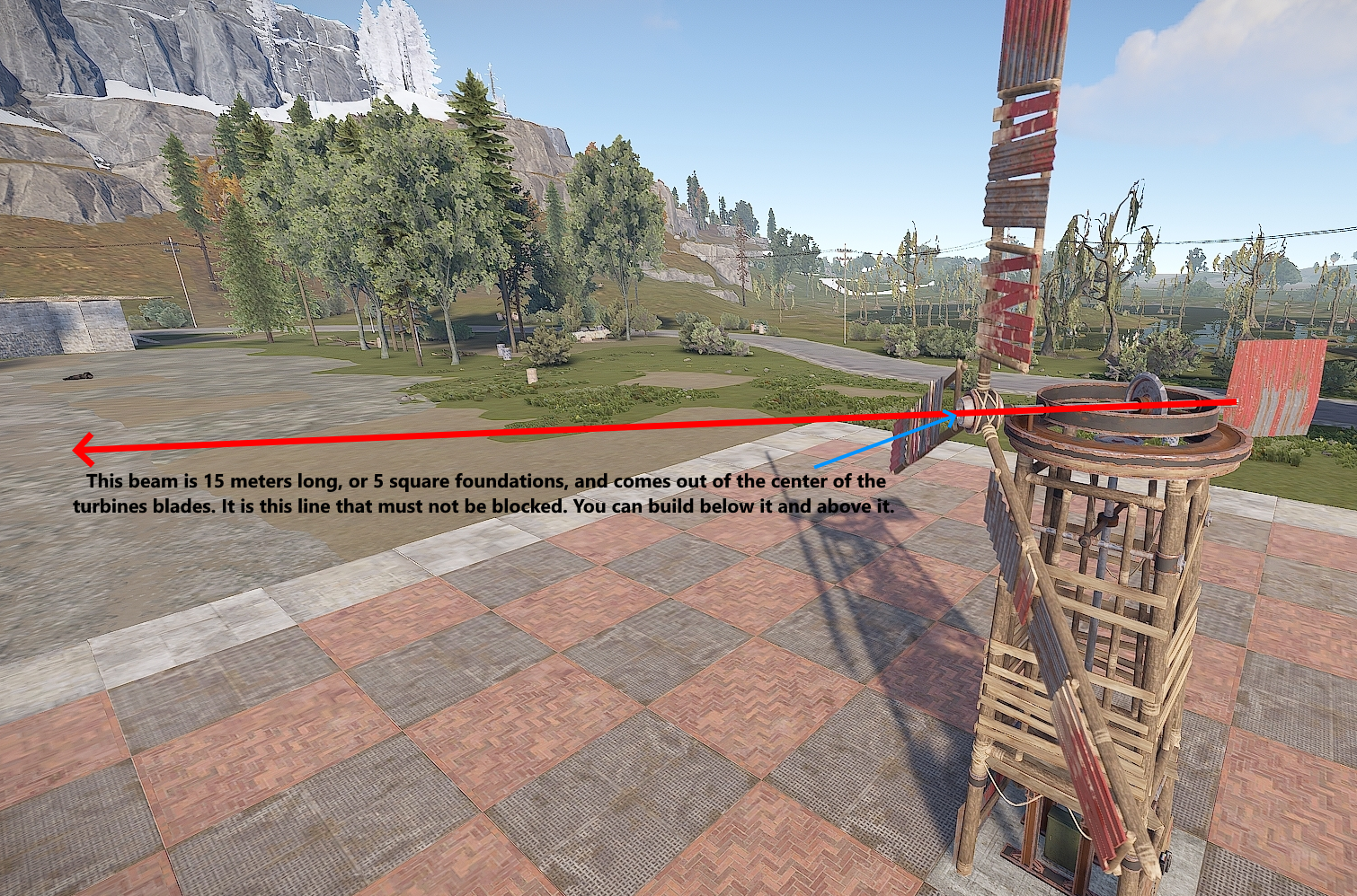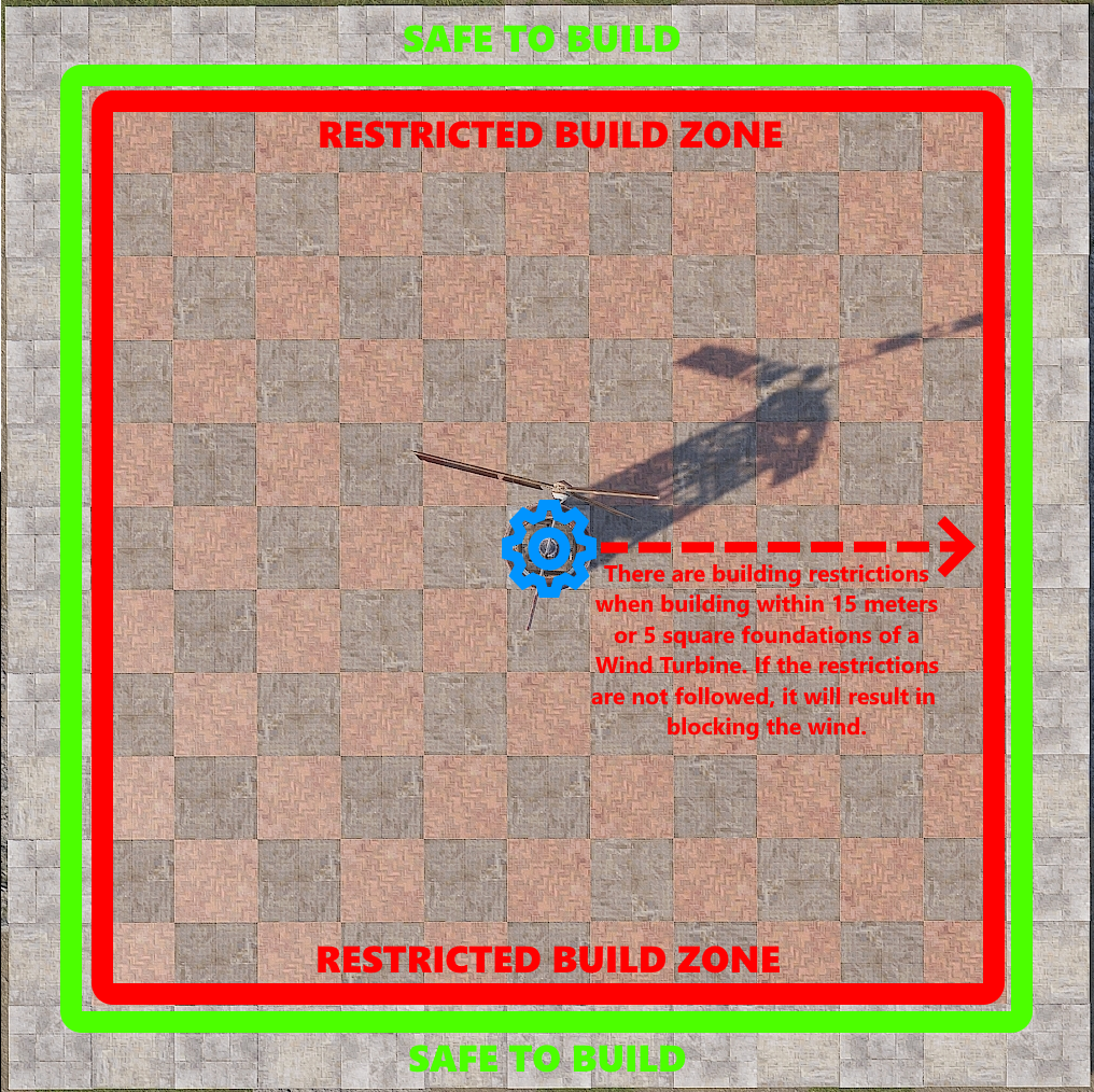 Building within the restricted zone is possible and it’s easier than people think. There is an invisible beam that sticks out the front of the turbine, at the intersection of the blades. It is inline with the horizontal drive shaft and sticks out 15 meters, or 5 square foundations. If this beam gets blocked by something a player deploys or builds, the turbine will stop spinning and stop producing power.