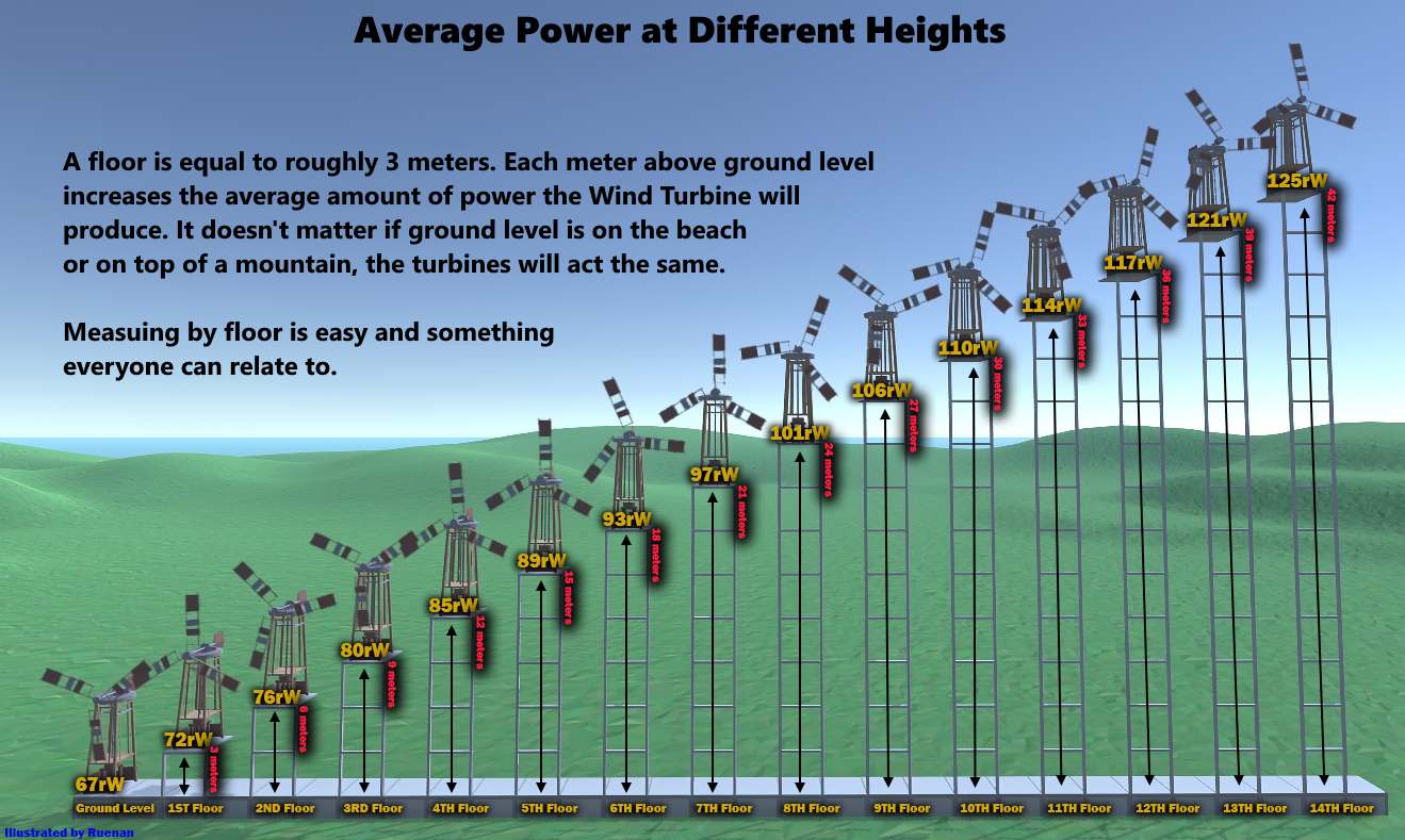 Knowing how close to the Wind Turbine structures and deployables can be placed is the first step. The next part is knowing how high they need to be built. The higher a turbine is placed, the more power it will produce on average. Height is referring to the distance between the turbine and the buildable ground below it. This means there is no difference between a turbine built on ground level at the beach or on the top of a mountain. If they are built at the same height off the ground, they will both produce the same amount of power. The next image is showing us how much average power can be expected when it is built above ground level.