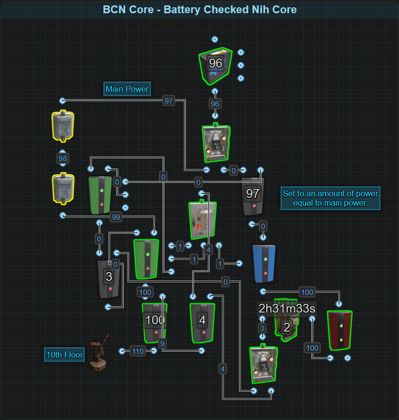 While this technically works for paralleling 2 batteries, consider using a secondary backup instead. 2 parallel batteries costs 5rW but a bypass secondary backup could cost as little as 2rW. This can also be true no matter the number of secondary batteries if there is no built in recharging. If recharging a secondary battery is built in, it adds a minimum of 2rW per battery to the power cost. Check out the section for Secondary Backups in Power Storage under Concepts.