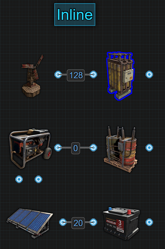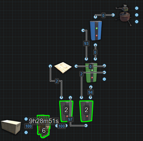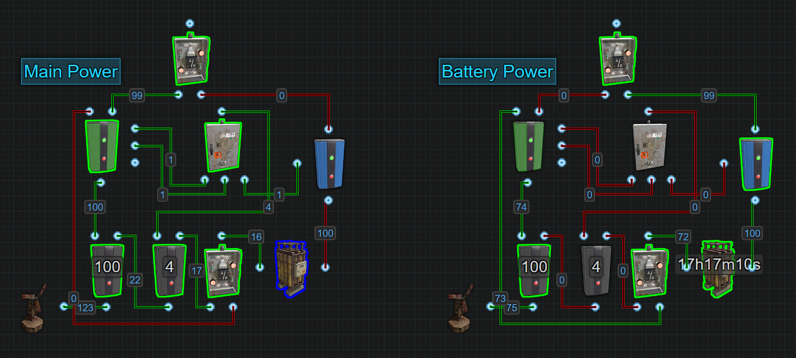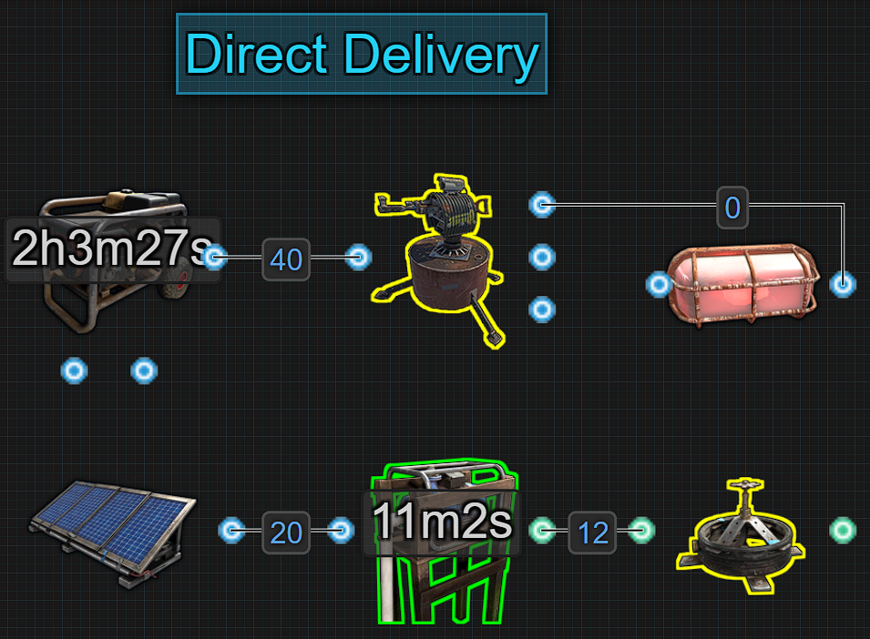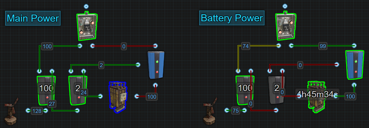 This is when the power source is directly connected to a circuit. If the power source is destroyed or stops producing power for any reason, the circuit will go offline. This method is a great solution for short term uses like getting some auto turrets asap for your clan or getting some water pumps online early for a berry farm. While this method is good for a very short time to get an early game advantage, it is not recommended to rely on this method for any length of time. Introducing batteries to a circuit to create backup power is more suited for long term use.