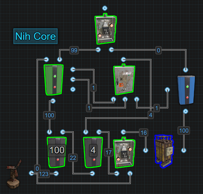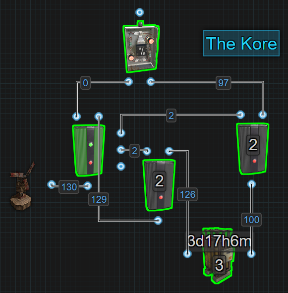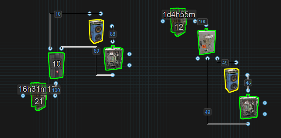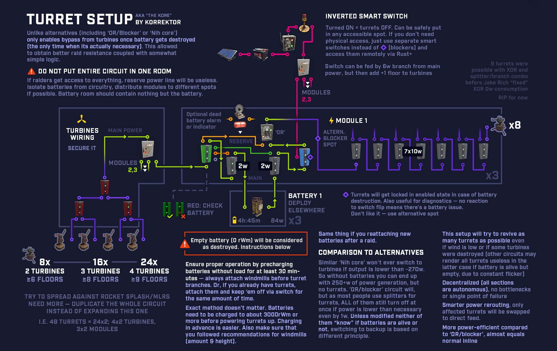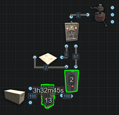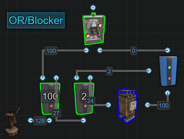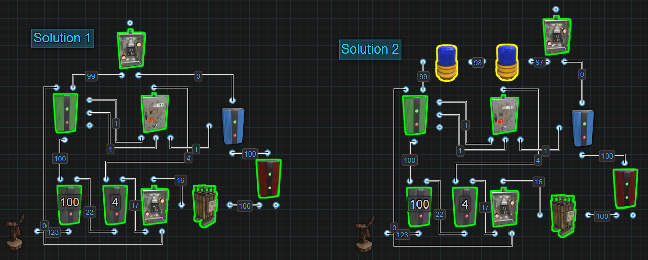 This is when the power source is directly connected to a circuit. If the power source is destroyed or stops producing power for any reason, the circuit will go offline. This method is a great solution for short term uses like getting some auto turrets asap for your clan or getting some water pumps online early for a berry farm. While this method is good for a very short time to get an early game advantage, it is not recommended to rely on this method for any length of time. Introducing batteries to a circuit to create backup power is more suited for long term use.