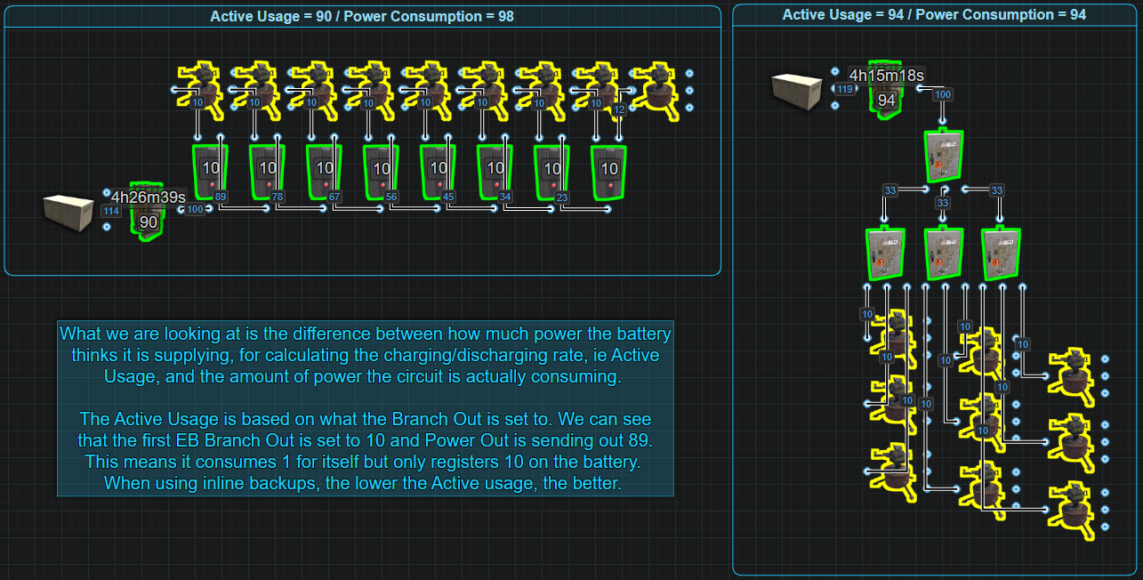 Due to this being the way it is, if you combine 2 batteries to get 200 power, try to use all 200 because no matter if the circuit needs 101 or 199, 2 large batteries will only last 4 hours. If they are only going to last 4 hours regardless, try to use as much of that 200 as possible to make it worth combining the batteries. Otherwise, split the circuit, run Inlines and minimize the Active Usage.