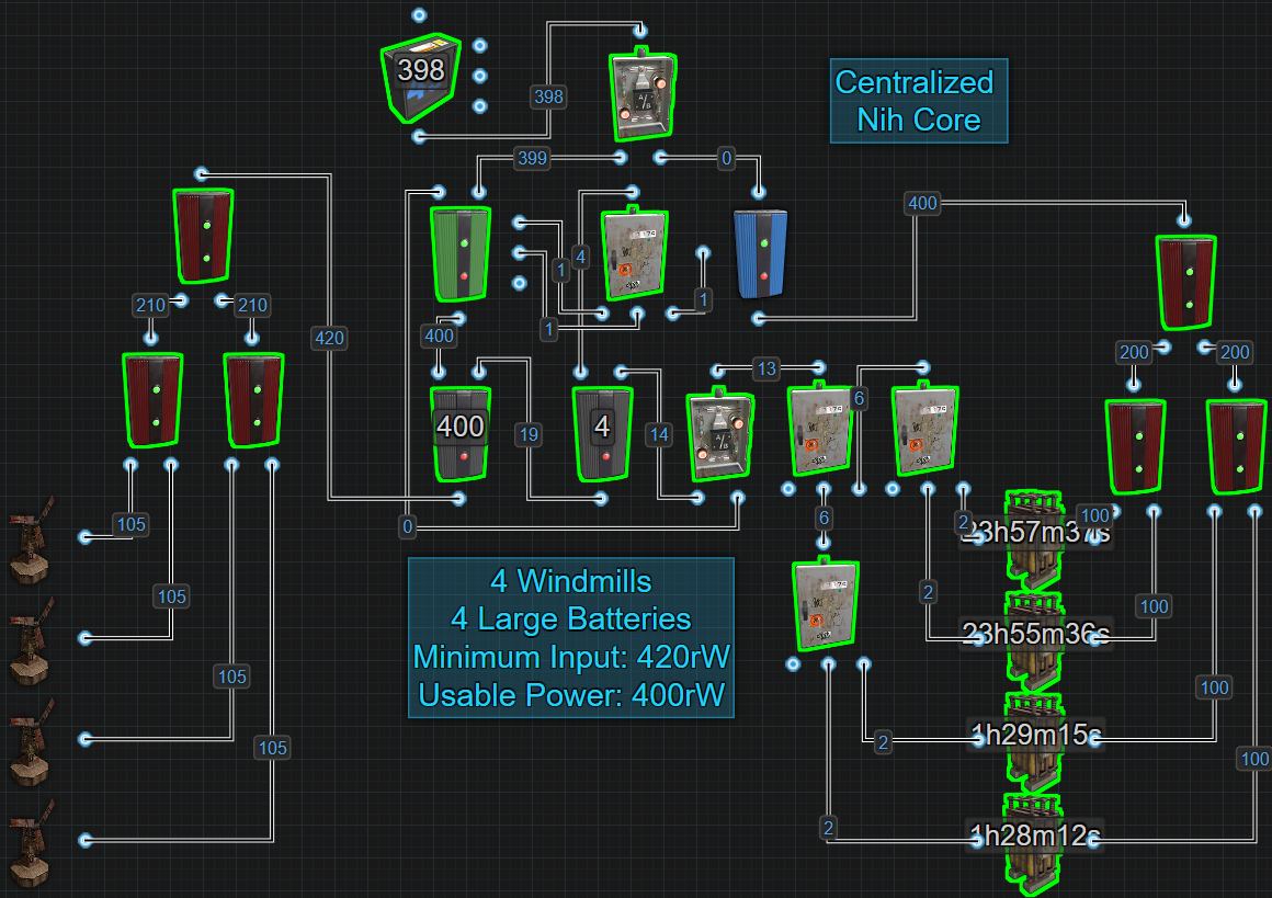 Deciding which backup to use really comes down to preference. They each have their own pros and cons and some may argue that 1 is better than another in different situations. For example, if you only need to power a few turrets and are in a hurry, you might find the simplicity of the Inline backup works for you. Maybe you are working with 300rW to 1000rW and a dozen Windmills, you might find the efficiency of the Nih Core is preferred. Having a good understanding of the concept Active Usage Vs Actual Power Consumed will also help you decide on a backup. At the end of the day, as long as the battery backup you go with, works when you need it to work, that was the right backup to choose.