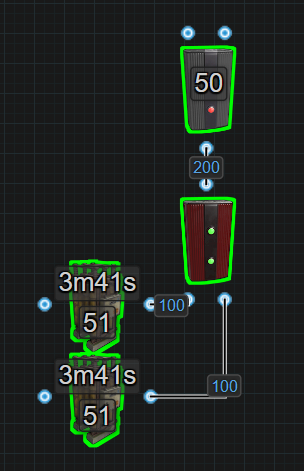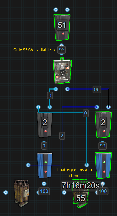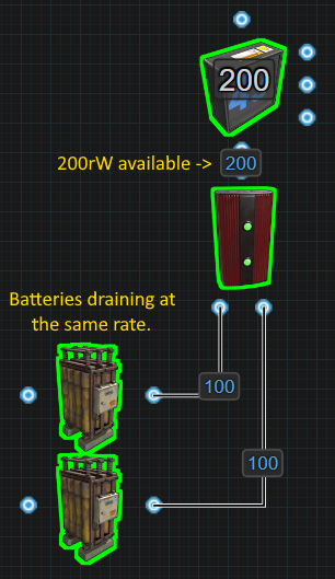 For example, in a circuit with 2 root combined batteries supporting a load of 50, it would seem to make sense that 50 power divided by 2 batteries equals 25 per battery. Rustricity doesn’t work like that and 50 power is taken from each battery and seen as Active Usage on both batteries. This means both batteries are draining at a rate of 50.