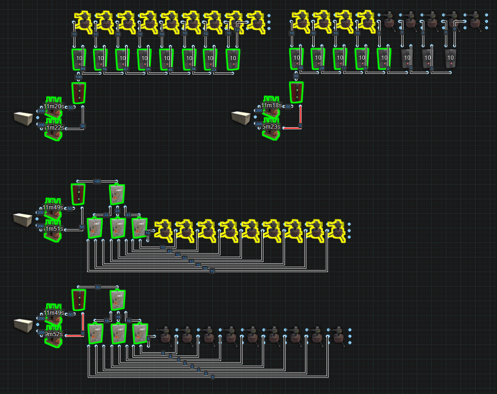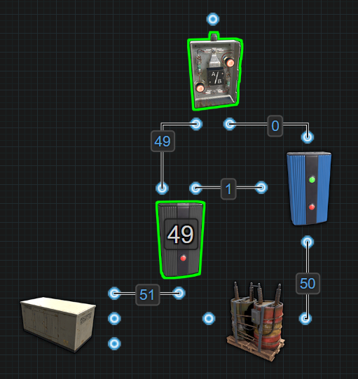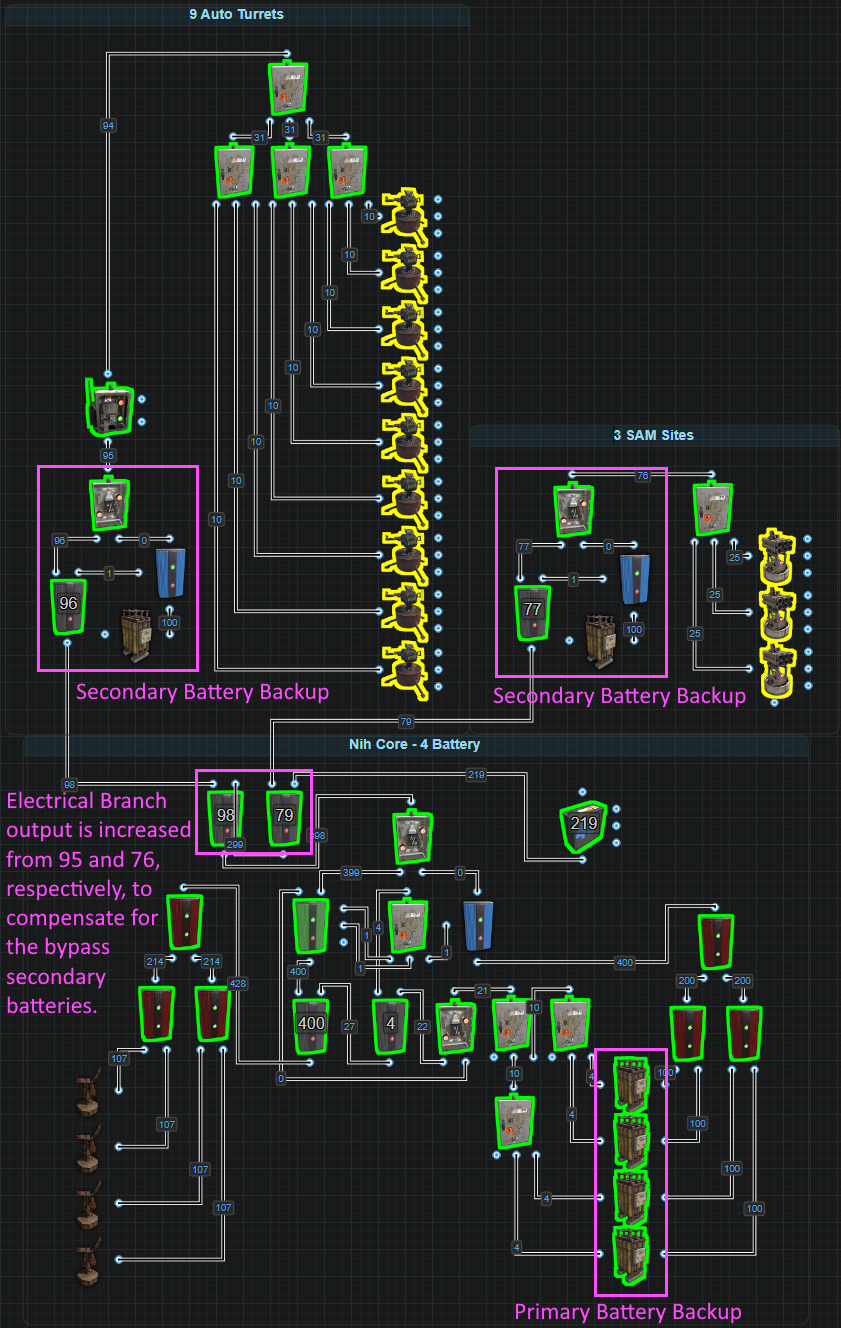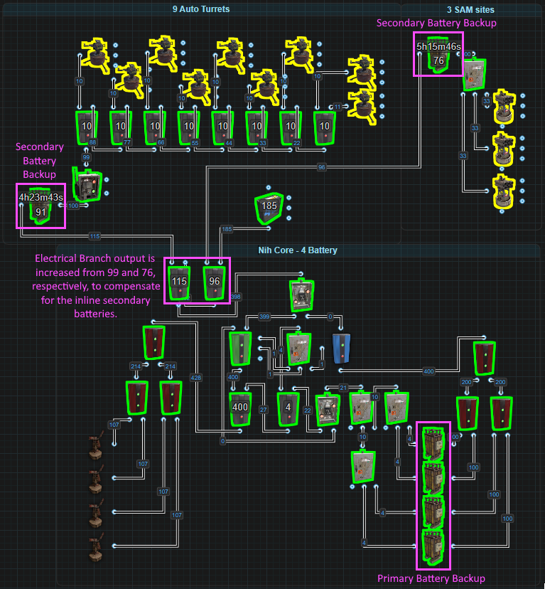 This is helpful in situations where you have a few small circuits where you dont want to force an Active Usage when the circuits are off. Now because the Electrical Branch only registers the Branch Out value as Active Usage and 0 for itself, we can trick batteries into thinking less power is being consumed. In the next picture, we have some examples using Auto Turrets.