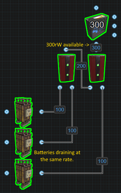 You can use a bypass system with 1 Large Battery and only use 50 power to double the life of the battery but, it is more common to see a bypass system used for 2 or more batteries to get a larger output. If we are using 2 or more batteries to get the higher output, a Root Combiner will be used. The moment we combine batteries to power a circuit that uses more than 100 power, both batteries will have an Active Usage of 100. This is because load sharing is not a thing in Rustricity. If the circuit only needs 50, both batteries will have an Active Usage of 50(plus 1 for the Root Combiner).