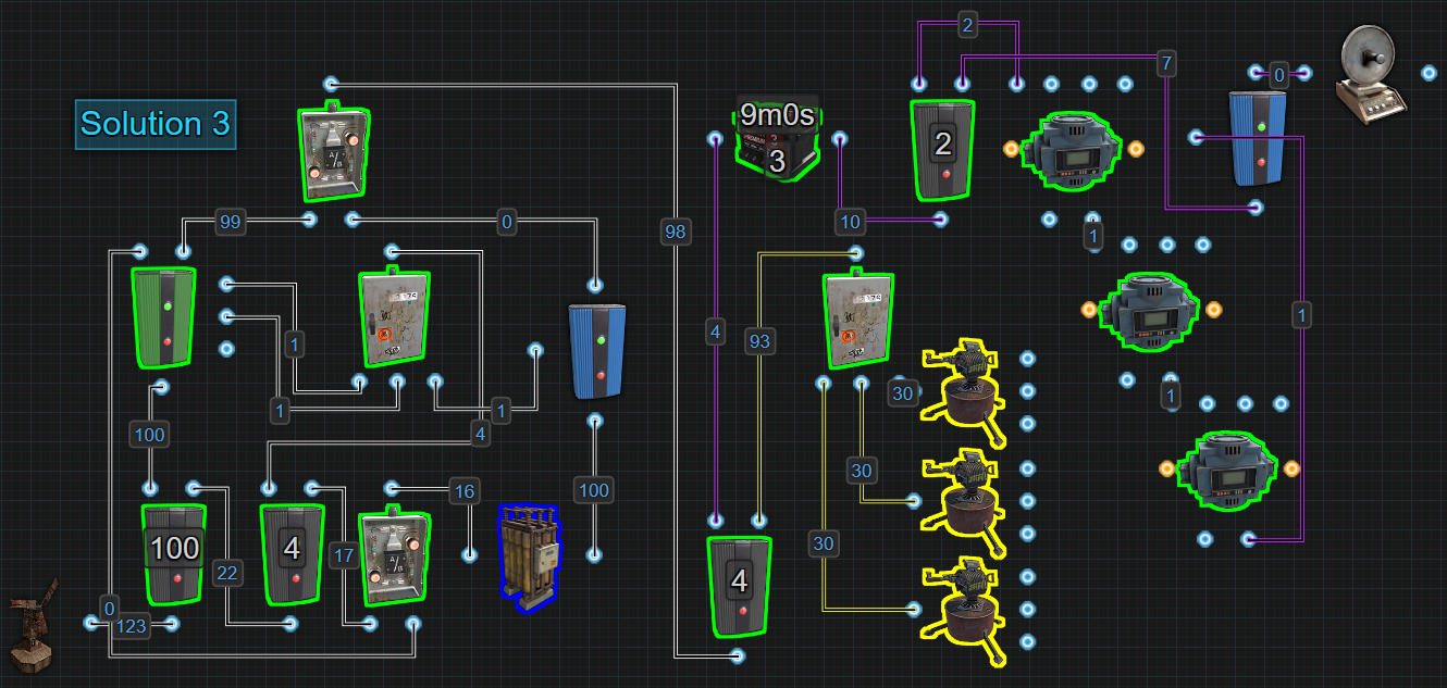 Now having said consuming less power when using a bypass backup is more important, there are times when it is worth consuming more for a bit of added security. In the next picture, for demonstration only, medium batteries have been root combined to power some Auto Turrets.