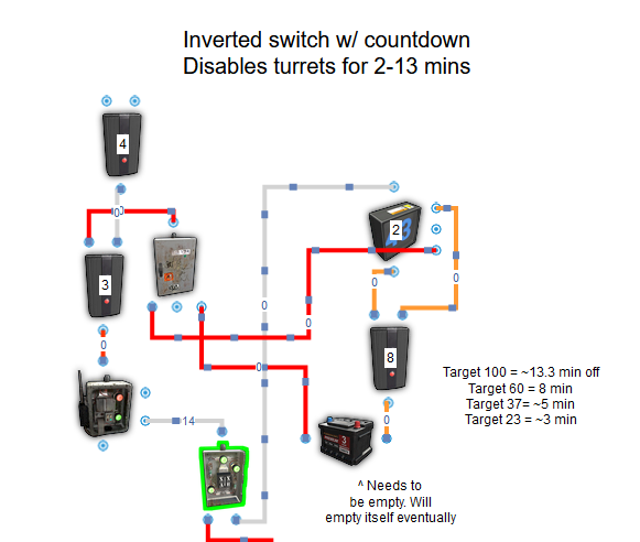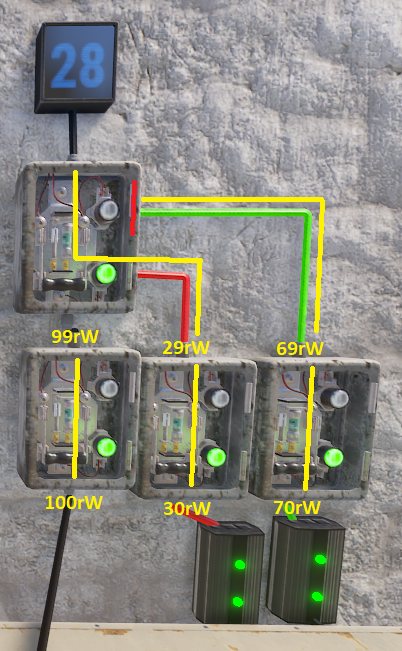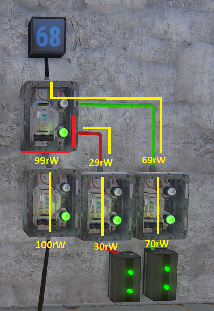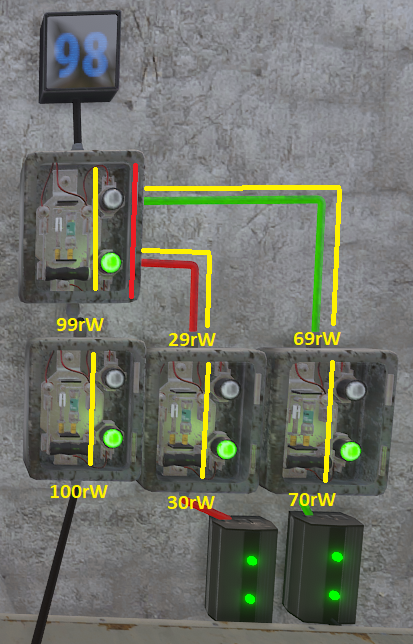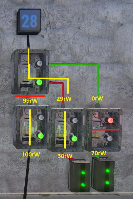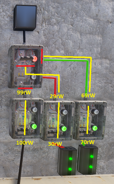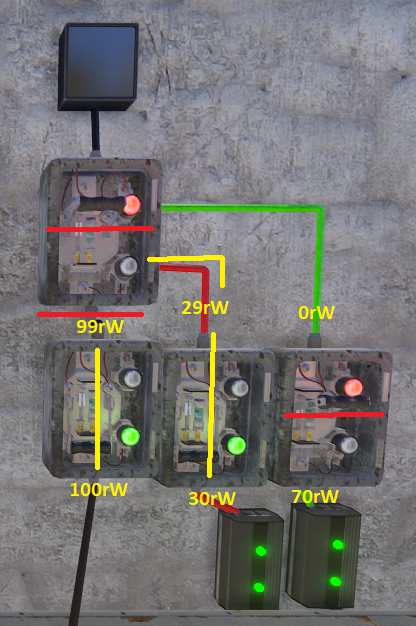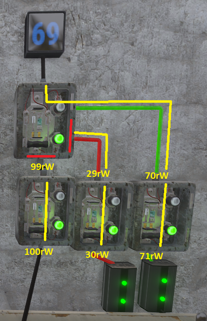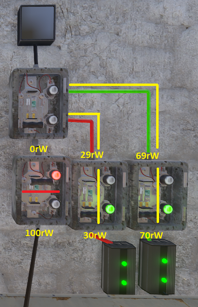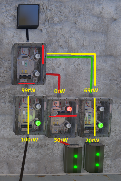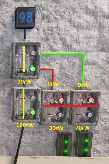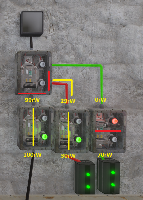 Starting off, we are using 3 Switches to provide 3 different amounts of power each input. Green wire is for Switch On. Red wire is for Switch Off. Black wire is for Electric Input on the bottom. Yellow lines mark the path power is taking. Red lines mark where power stops. In this first picture, we are sending power to the bottom input and the Switch sends it out the top, with the expected power loss.