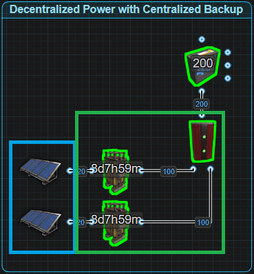 The first example shows decentralizing by separating the different end circuits with independent power supplies and battery backups. The Auto Turrets get their own power supply and inline battery. Same for the SAM sites, interior lights, exterior lights and HBHF grid, they all have their own power supply and inline battery backup.
